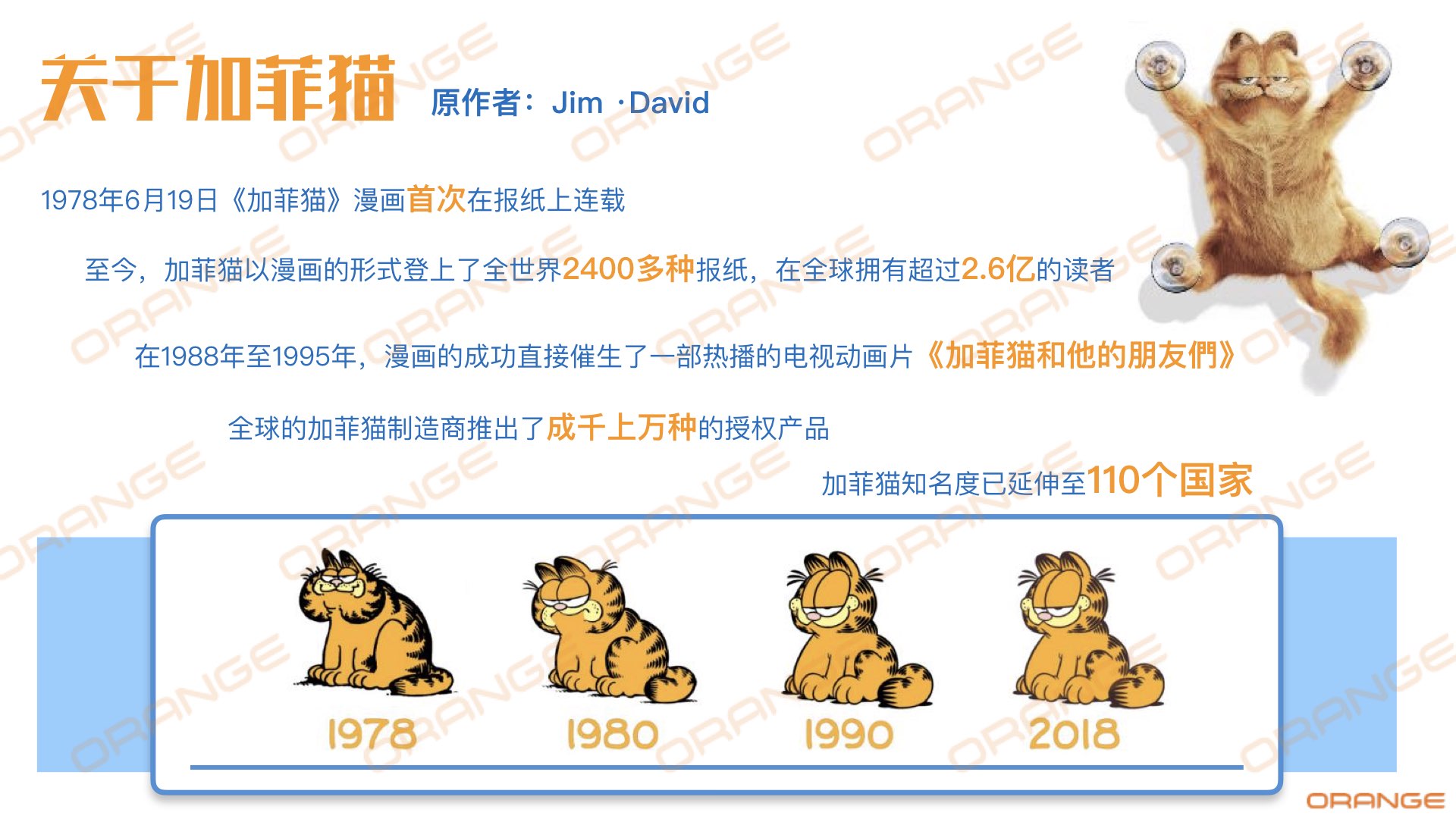 Garfield,国际经典动画IP。每个人心中住着一只加菲猫! 人类本性爱吃、爱玩、爱睡享受生活=happiness幸福=加菲猫的生活态度,投射你内心所想。